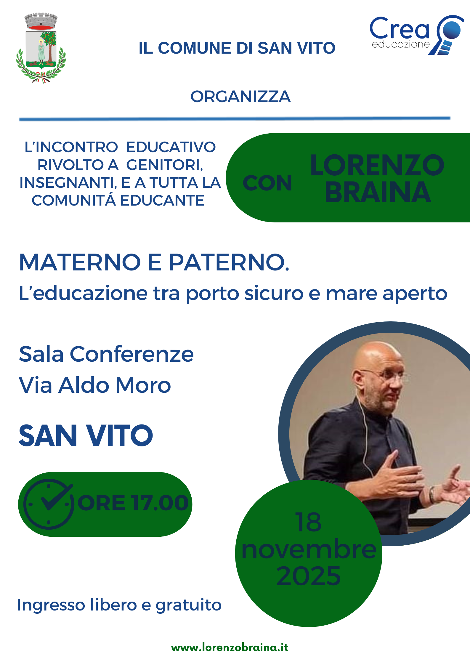 Si informano i cittadini che il prossimo incontro educativo a cura del Dott. Lorenzo Braina è calendarizzato per il giorno 18 novembre 2025, giornata nella quale si tratterà il tema "Materno e Paterno. L'educazione tra porto sicuro e mare aperto".